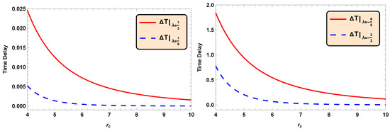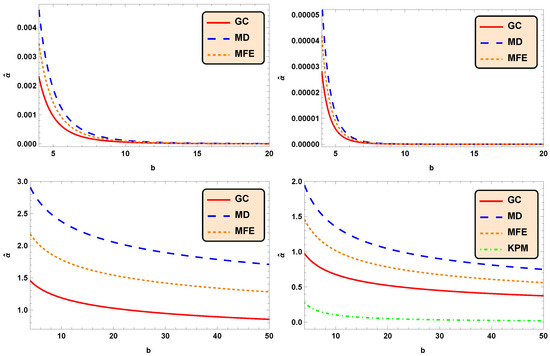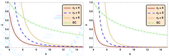 We graphically demonstrate the deflection angle in Figure 1 (Right). One can see that this deflection angle has the same behaviors as the deflection angle , but it is smaller in amount compared to . In week limit filed approximation, the deflection angle (SC) of the Schwarzschild black hole = 4M/b, M is the mass of the black hole [142]. From Figure 2, it is clear that the rate of decreasing of our reported deflection angles and is higher than the rate of decreasing of the deflection angle SC against the impact parameter b. Therefore, these deflection angles cannot mimic the deflection angle (SC) of the Schwarzschild black hole.