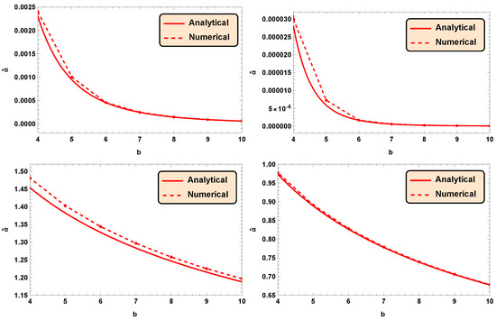 We now compare the approximated deflection angles with their exact numerical values using graphical representation. In order to carry this out, we have solved Equation (36) using a numerical technique corresponding to and with step length = 1. The approximated deflection angles for all the cases associated with are slightly lower than their respective exact numerical values, as is clear from Figure 4.