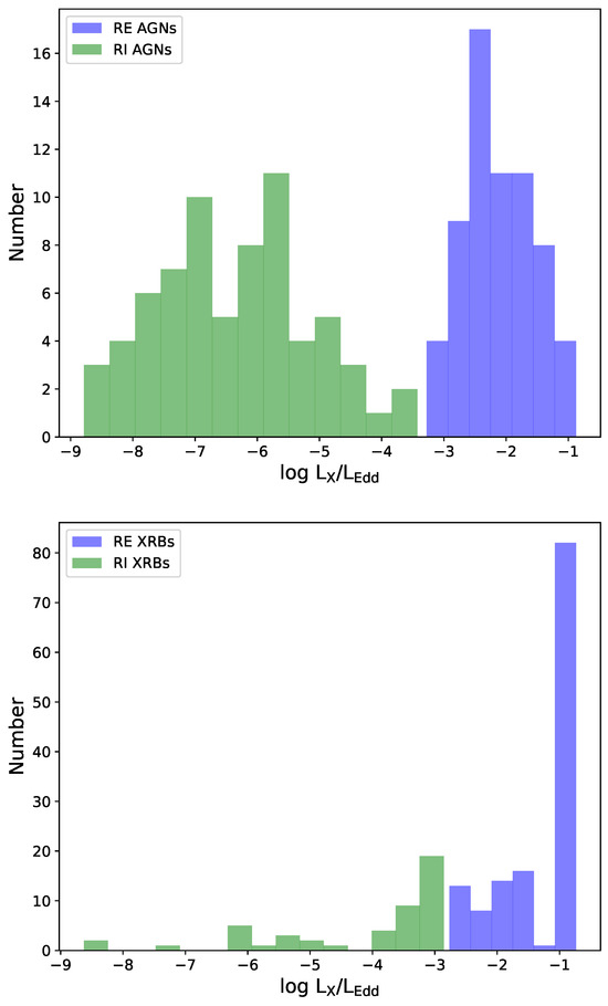 Distribution of the Eddington ratio for the radiatively efficient (purple histogram) and radiatively inefficient (green histogram) active galactic nuclei and black hole X-ray binaries. The top panel represents the distribution of the Eddington ratio for AGNs in our sample; the bottom panel represents the distribution of the Eddington ratio for XRBs in our sample.