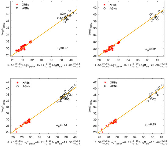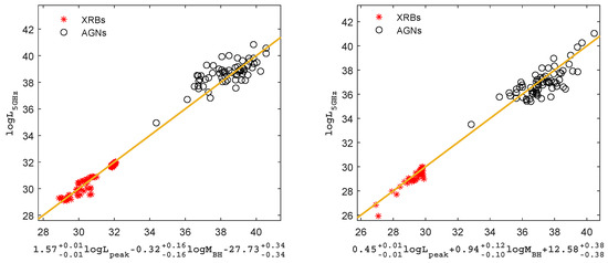 Equations (12) and (13) represent the best fit for radiatively inefficient AGNs and XRBs subsamples, respectively. The uncertainties in the radio luminosities, peak luminosities, and black hole masses of the AGNs adopt typical observational uncertainties, which are = 0.2 dex [56], = 0.3 dex [57], and = 0.4 dex [58]; the typical observational uncertainties for XRBs are = 0.1 dex, = 0.1 dex [14,59] and = 0.15 dex [60], where the uncertainties of XRBs were inferred from the propagation of error method. The best fits for the fundamental plane of radiatively inefficient black hole objects are as follows: