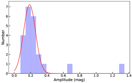 Figure 1. Distribution of the amplitude of periodic variations from noneclipse CVs. The red line represents a Gaussian fit. - High-amplitude periodic variation. In contrast, high-amplitude periodic variations represent modulations with an abnormally high amplitude. Here, we roughly define them as periodic variations with an amplitude larger than 0.4 mag.
