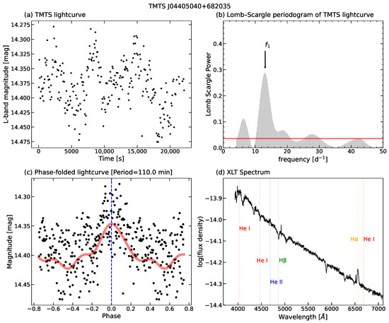 (a) TMTS light curve of TMTS J04405040+6820355; (b) Lomb–Scargle periodogram of TMTS J04405040+6820355, the horizontal red line represents the 0.1% significance level; (c) phase-folded TMTS light curve with min, with the red line representing the best-fit model of fourth-order Fourier series; (d) the XLT spectrum of TMTS J04405040+6820355.