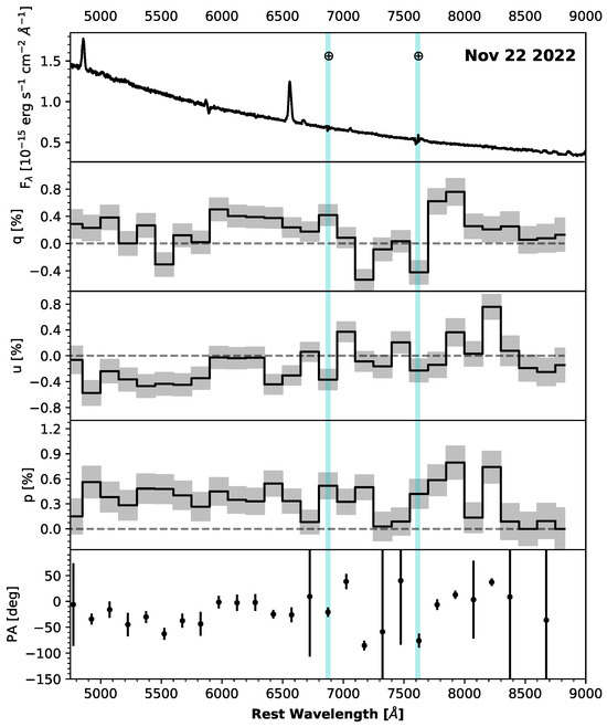 Spectropolarimetry of TMTS J06183036+5105550 obtained with the Lick/Shane 3 m telescope on 22 November 2022. The cyan vertical bands represent the regions of telluric correction. The top panel presents the total-flux spectrum. The panels below the total-flux spectrum represent the polarimetry after the ISP correction. The gray-shaded area indicates the associated 1 uncertainty.