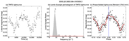 (a) TMTS light curve of SDSS J013855.86+242939.2; (b) Lomb–Scargle periodogram of SDSS J013855.86+242939.2, the horizontal red line represents the 0.1% significance level; (c) phase-folded light curve with a period of 179.0 min. The red line represents the best-fit model of fourth-order Fourier series.