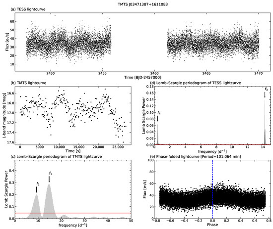(a) TESS light curve of TMTS J03471387+1611083; (b) TMTS light curve of TMTS J03471387+1611083; (c) Lomb–Scargle periodogram of the TMTS light curve in (b), the horizontal red line represents the 0.1% significance level; (d) Lomb–Scargle periodogram of the TESS light curve in (a), the horizontal red line represents the 0.1% significance level; (e) phase-folded light curve with min.