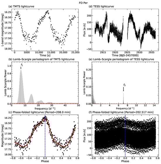 (a) TMTS light curve of FO Per; (b) Lomb–Scargle periodogram of the TMTS light curve; (c) phase-folded TMTS light curve with min, with the red line representing the best-fit model of fourth-order Fourier series; (d) TESS light curve of FO Per; (e) Lomb–Scargle periodogram of the TESS light curve in (d), the horizontal red line represents the 0.1% significance level; (f) phase-folded TESS light curve with min.