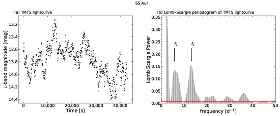 (a) TMTS light curve of SS Aur; (b) Lomb–Scargle periodogram of the TMTS light curve, the horizontal red line represents the 0.1% significance level.