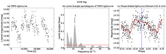 (a) TMTS light curve of V378 Peg; (b) Lomb–Scargle periodogram of the TMTS light curve, the horizontal red line represents the 0.1% significance level; (c) phase-folded TMTS light curve with min (a second-order polynomial was subtracted to detrend), with the red line representing the best-fit model of fourth-order Fourier series.