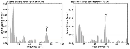 (a) Lomb–Scargle periodogram of RX And; (b) Lomb–Scargle periodogram of RU LMi. The horizontal red lines represent the 0.1% significance level.