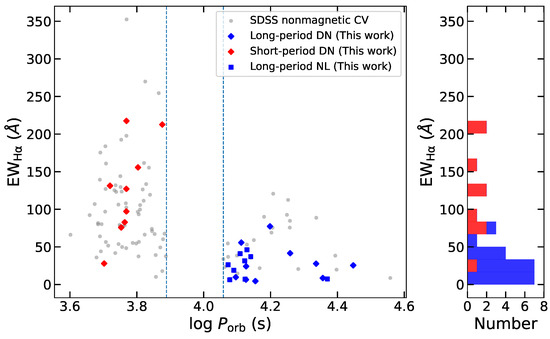 As introduced in Section 2.3, we collected the spectra of 44 CVs, for which the EW and FWHM of H emission were measured. Since the accretion in magnetic CVs is governed by magnetic fields, their accretion geometries are essentially different from those of nonmagnetic systems in which the radiation of accretion disks dominates the emission [10,87]. Here, we focus on the spectroscopic properties of the 28 nonmagnetic CVs.