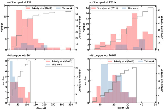 Histogram distribution of EW (a,b) and FWHM (c,d) of H emission in spectra of nonmagnetic CVs. Panels (a,c): distribution of short-period nonmagnetic CVs. Panels (b,d): distribution of long-period nonmagnetic CVs. The red columns represent the nonmagnetic CVs from Szkody et al. [40], while the blue columns represent the nonmagnetic CVs from our sample. The gray lines show the cumulative distributions of the SDSS nonmagnetic CV sample.