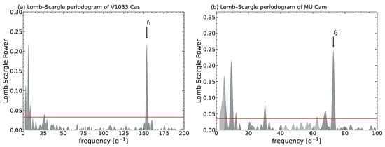 (a) Lomb–Scargle periodogram of V1033 Cas; (b) Lomb–Scargle periodogram of MU Cam; and indicate the spin frequencies of the two sources, respectively. The horizontal red lines represent the 0.1% significance level.