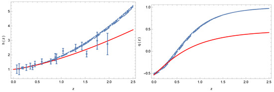 Additionally, in the context of the thermodynamics of open systems, the total pressure makes two contributions, namely the usual thermodynamic pressure (p) and the creation pressure (), i.e., . The creation pressure can be viewed as the pressure responsible for describing, in an effective way, the irreversible matter creation processes that occur within the bulk of the open system, which, in this case, is the observable Universe. Hence, Equation (22) can be expressed as