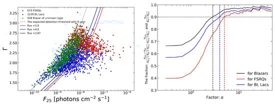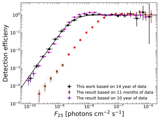 - Detection efficiency: The source count distribution at , shown in the left panel of Figure 4, displayed a broken power law for ph cm−2 s−1. Below this flux threshold, the observed distribution dropped rapidly due to the challenges in detecting fainter sources with Fermi-LAT. We calculated the detection efficiency by comparing observed sources with the theoretical distribution in photon flux.