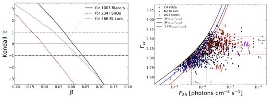 - Flux–index relations: Addressing the bias towards hard sources in the photon flux limit (Figure 1), we applied the EP method to correct for this bias, resulting in a correlation-corrected spectral index . Our analysis revealed no significant correlation for all blazars (), with only a weak correlation being observed for FSRQs () and BL Lacs () individually.