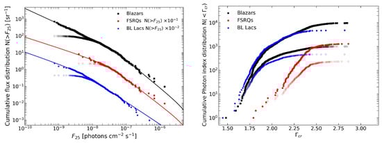 - Singal, J.; Petrosian, V.; Ajello, M. Flux and Photon Spectral Index Distributions of Fermi-LAT Blazars and Contribution to the Extragalactic Gamma-Ray Background. Astrophys. J. 2012, 753, 45. [Google Scholar] [CrossRef]