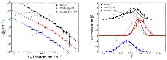 - Marcotulli, L.; Di Mauro, M.; Ajello, M. Source-count Distribution of Gamma-Ray Blazars. Astrophys. J. 2020, 896, 6. [Google Scholar] [CrossRef]