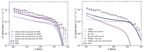 - EGB and IGRB: Through the nonparametric determination of intrinsic distributions of photon flux and the spectral index, along with considerations of the detection efficiency, we directly calculated the contributions of all Fermi-LAT blazars to the EGB’s and IGRB’s intensity and spectra. Our findings indicate that blazars up to the flux threshold of Fermi-LAT, i.e., ph cm−2 s−1, could explain 34.5% of observed EGB photons and 32.6% of observed IGRB photons. For FSRQs and BL Lacs, we estimated their contributions to the EGB without considering the detection efficiency, revealing that FSRQs and BL Lacs could account for 19.6% and 13% of the observed EGB, respectively.