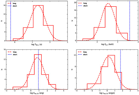 - Kouveliotou, C.; Meegan, C.A.; Fishman, G.J.; Bhat, N.P.; Briggs, M.S.; Koshut, T.M.; Paciesas, W.S.; Pendleton, G.N. Identification of Two Classes of Gamma-Ray Bursts. Astrophys. J. Lett. 1993, 413, L101. [Google Scholar] [CrossRef]