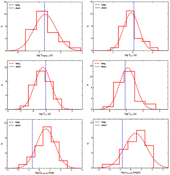 Distributions of prompt emissions and flares. The red soild and dashed lines represent the distributions and best-fit of LGRBs, respectively. The blue dashed lines represent the values of SGRBs.
