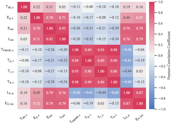 The. Pearson correlation coefficient matrix of the various parameters in the rest frame, where red and blue colors represent tight positive correlations and negative correlations, respectively.