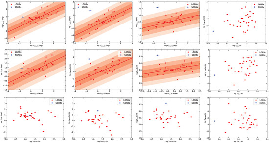 We also study three-parameter correlations involving . After accounting for , also has weak correlations with , , and , , respectively. Similarly, the –– correlation and the –– correlation were also found in the X-ray and optical afterglow, respectively [43,46].