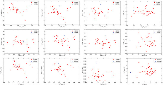 where a is constant, b and c are the coefficients of and , respectively. Due to the complexity of GRB sampling, an intrinsic scattering parameter () is introduced, as has usually been done by other researchers [38,39]. This extra variable follows a normal distribution of N(0, ), which represents all the contributions to y from other unknown hidden variables. The joint likelihood function for the coefficients of a, b, c, and is