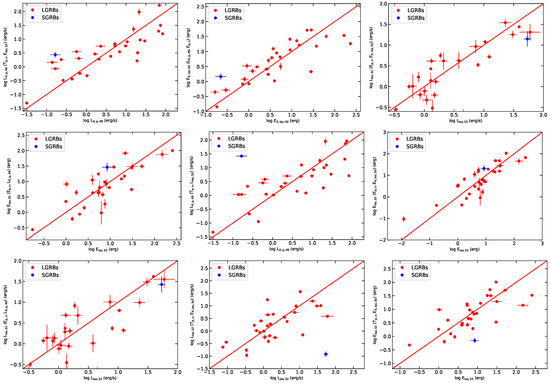 The three-parameter correlations between prompt emission and XRFs. The red and blue points present the LGRBs and SGRBs, respectively. The red lines represent y = x.