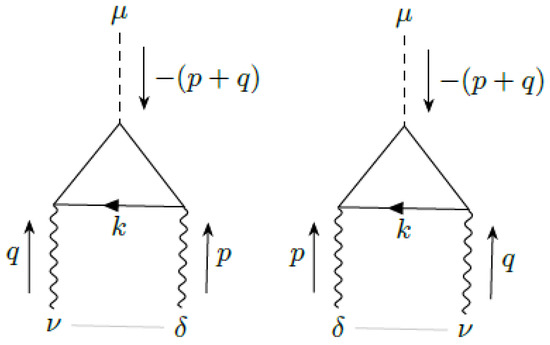 There are four topologically distinct graphs, plus permutations of the external legs, that contribute to the axial anomaly in four dimensions (Figure 3, Figure 4, Figure 5 and Figure 6). The Feynman rules are written in Figure A2. They are fundamental to satisfying the formal Ward identity for the vector current (charge conservation) as well as the right computation of the axial anomaly [26].