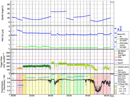 Overview plot used in data quality checks for a single observing night at the MAGIC telescope site. Four panels (enumerated from top to bottom) allow for an overview of the most important parameters, which describe the data-taking conditions and/or impact on the data quality. Panel 1: Zenith angle of the telescope pointing, with vertical lines marking the wobble position or source changes. Panel 2: Mean direct current (DC; green and red) and the median discriminator threshold (TH; blue) for the camera PMTs. The colour of the DC plot roughly captures the dark time (green) and moon time (orange) observations, with dark time observations further separated into extragalactic (dark green) and galactic (light green). Panel 3: Coincidence trigger rates between the two MAGIC telescopes. Panel 4: Atmospheric aerosol transmission, based on measurements by the LIDAR and the pyrometer. Two transmission measures are given based on the LIDAR profiles, from 3 km and from 9 km above the site, quantifying the dust intrusions (calima) and cloud effects, respectively. Colour shading gives a rough guidance whether the data may be used without corrections, with nominal or increased energy threshold (green, light yellow), may be corrected for atmosphere effects (dark yellow), or cannot be used at all due to poor quality (red).