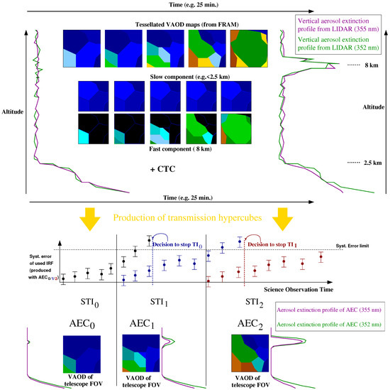 Scheme for the determination of new Stable Time Intervals (STIs) and new Monte Carlo (MC) simulated instrument response functions (IRFs): on the top, two possible aerosol extinction profiles at two wavelengths obtained from LIDAR are sketched, with nested VAOD maps obtained from FRAM during a typical CTAO observation block of 25 min. In this particular case, a typical aerosol ground layer of a clear night that ranges up to 2.5 km above ground evolves slowly towards a higher Ångström exponent (smaller average particulate sizes) at a similar vertical profile, whereas a cloud at a typical height of about 10 km moves into the FRAM field of view. The joint analysis of FRAM and LIDAR (and possibly CTC) data divides the tessellated VAOD maps from FRAM first into a slow and a fast component and then produces the aerosol transmission hypercubes through interpolation, both in time and in altitude. The offline science data analysis calculates systematic errors introduced by the not perfectly matching aerosol conditions and the aerosol extinction cube used for the production of the given IRFs, and decides to start new STIs as the systematic error exceeds a predefined limit. Each STI is then analysed with its (simplified) AEC used for the production of a tailored IRF. See text for further details.