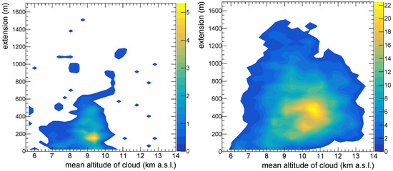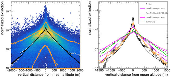 Finally, we divided the data set into four categories of clouds: low clouds (), medium-altitude clouds (), and high clouds (). The latter are not shown, because they barely influence the observed Cherenkov light [38]. The medium-altitude clouds were further divided into three VOD ranges, in order to take into account the observed dependence of cloud extension on the VOD. Finally, summer clouds were also treated separately. Figure 4 (right) shows the distribution of the mean of the normalised extinction for these cases, together with the results of a fit to Equation (1). Table 2 lists the obtained fit results. We observe that low clouds and summer clouds showed a non-negligible contribution of 47% and 13%, respectively, of thin clouds with Lorentzian spreads as low as a few tens of meters. The rest of the clouds were found with spreads between 200 m and 300 m, increasing to 400 m and >500 m as the VOD gets higher. It is interesting to observe that the vertical asymmetry of these thicker clouds was negative (, i.e., the cloud appears skewed towards altitudes below ) for all cases except for the summer clouds, where the skew was towards altitudes above the mean.