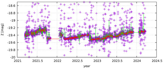 The fast fluctuations are believed to occur mainly due to slight changes in the focus of the lens with the changing temperature through the night; the decrease in those from September 2021 was attributed to the change of the lens from a Zeiss 135/2 to a Samyang 135/2, which has far less optical aberrations, in particular off the centre of the image; a further change occurred in March 2022 due to an improved mechanical structure and optical alignment. The dependence of the zero point on focusing and alignment—in general on the point spread function (PSF) of stars in the image—can be significantly lowered using PSF-based photometry [40], but this is still a work in progress, and it was not applied to real-time processing. The general rise in the zero point was mainly due to dirt accumulation on the lens, which reduced the sensitivity of the system. The October 2022 decrease corresponded to a site visit during which the lens was cleaned. The only other documented cleanings happened during the lens replacement and alignment described above; the reasons for the zero-point changes not always being monotonous in time are thus unclear.