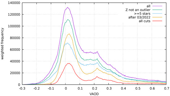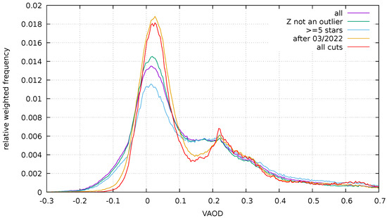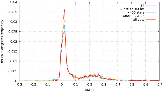 During the three years of the program, VAOD was estimated for over 2.2 million tiles from over 67 thousand images. The distribution of the resulting VAOD values weighted by the number of stars in the tile is shown in Figure 6. This distribution was broad with many negative values, but this could be improved by imposing a series of quality cuts on the data. First, we required that the zero point used for the processing not be an outlier. Further, we specified that at least five stars should be used for the VAOD calculation in the tile—this was the goal of the Voronoi procedure in the first place, but due to a mistake in the processing pipeline, the cuts used to calculate the tile and to actually select the stars for processing were different. Finally, we selected data taken after 03/2022, that is, after the installation of the Samyang lens and clearing out the problems caused by the Tajogaite eruption, when the zero-point calibration was markedly less stable. The effects of these cuts become clearer in Figure 7, where the distributions are normalised with the number of entries after the cuts (nearly 300,000 entries, after all three cuts were applied).