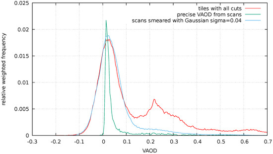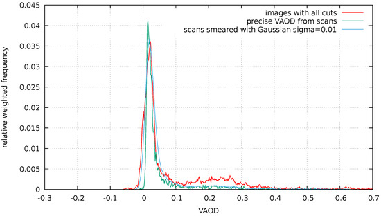 Distribution of VAOD values measured in entire images after all cuts compared with the distribution of the precise VAOD measurements from scans without and with a smearing with a Gaussian with .