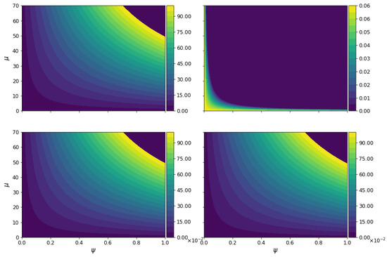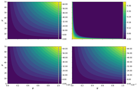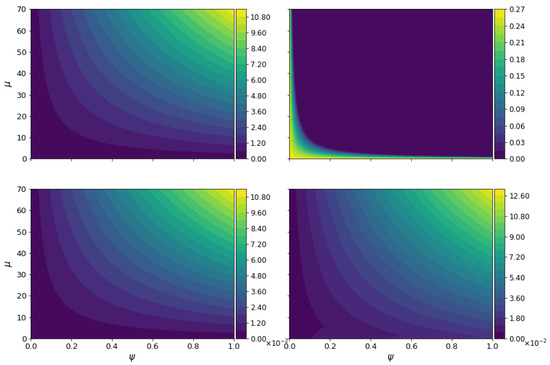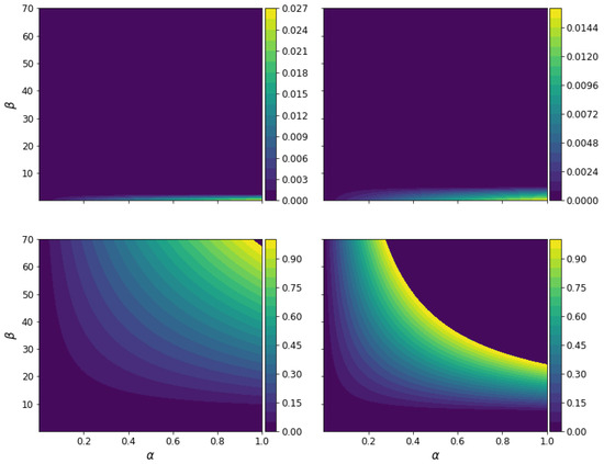 Contour plot for forbidden regions for (left upper plot), (right upper plot), (left bottom plot), and (right bottom plot) taking . goes from 0 to 1, ranges 0–70, and . Here, the scale is , and the forbidden values are shown in purple.