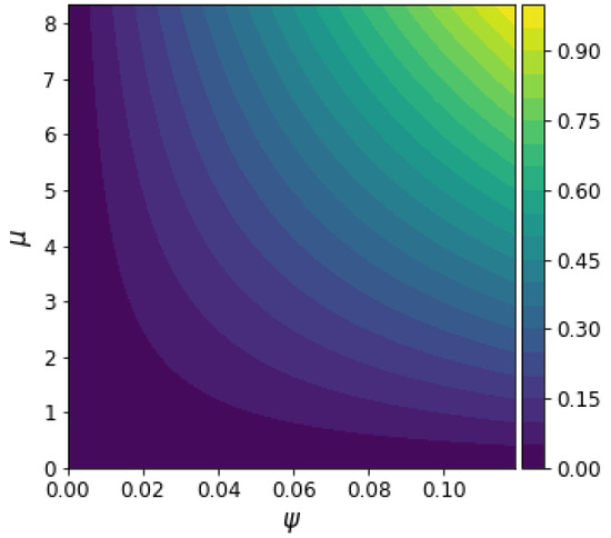 Contour plots display the forbidden regions for (left plot) and (right plot) taking . runs from 0 to 1, ranges 0–70, and . Here, the amplitude scale is and the forbidden values are shown in purple. We can see that the greatest contribution comes from .