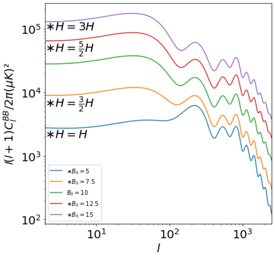 The B-mode spectrum from the PMF vector mode, in JF, and different values of the magnetic field in EF nG. The results pictured in this figure were arrived at using MagCAMB [55,56].