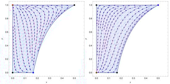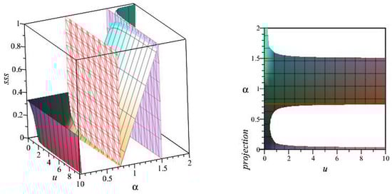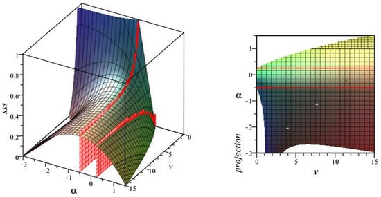 Plot of the surface given by Equation (29), where , is shown in the left panel, while the projection onto the plane is shown in the right panel. The parallel vertical planes (red crosshatched diagonal line pattern) that cut the surface are located at the values and , respectively. In the part of the surface which is cut by these planes (red lines in the right panel) the SSS satisfies the bounds for any u (dark región between the red lines in the right panel).