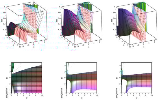 Plots of the squared speed of sound in Equation (32) vs. , for different values of the parameter b, are drawn in the top figures, while in the bottom figures the corresponding projections onto the plane are shown. From left to right, , 1, and , respectively. The region over the surface between the perpendicular planes (strip between red lines in the projection) is where the SSS meets the bounds . i.e., in these regions is where the model is free of instability against small perturbations of the background and of tachyon instability as well, for any value of v. As seen, for larger values of the constant b the strip is wider in the parameter: for , while for and for .