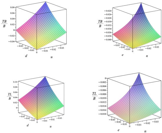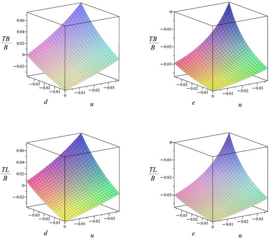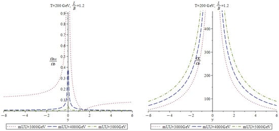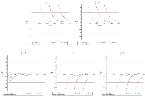 Depending on the charge parameter, the density ratios ( and ) behave hyperbolically, as shown in Figure 1. Note that this dependence results from the condition for the Higgs boson chemical potential.