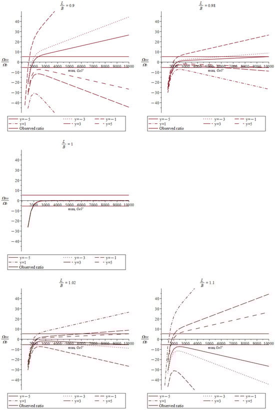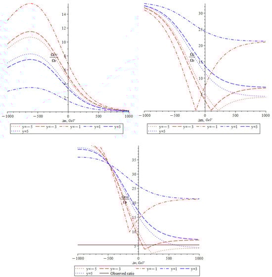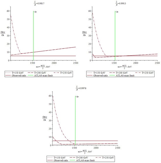 In this consideration, the ratio can vary in very broad limits, practically up to infinity. Such behavior should significantly affect other physical parameters of the scenario, for instance, mass dependence of the densities ratio, as seen in Figure 2, for the specific case . Here, the ATLAS experimental limit [] is denoted by the vertical green lines, the observed value of the density ratio [] is depicted by the horizontal line.
