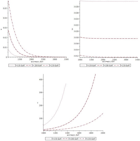 The basic parameter of cosmological plasma, in which phase and sphaleron transitions occur, is the temperature of the medium. The height of the potential barrier (or the energy of the sphaleron) as well as the sphaleron rate can be estimated in the Standard Model by using the value 100–200 GeV [,] and supposing that this is the freeze-out temperature of sphaleron. However, these parameters can change in various extensions, and therefore, we will consider a slightly extended temperature range, 150–250 GeV, as was suggested in Refs. [,]. As for the Standard Model particles (excluding t-quark), the inequality holds for them, so that (for fermions) and (for bosons).