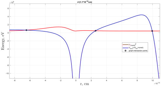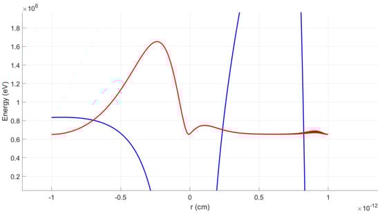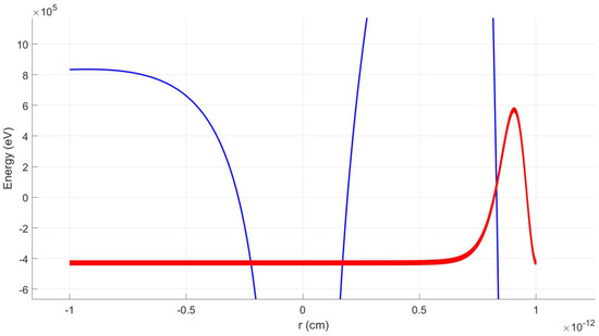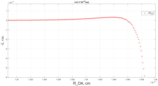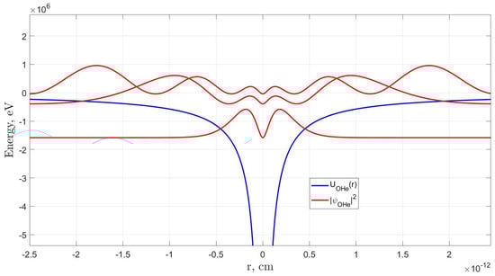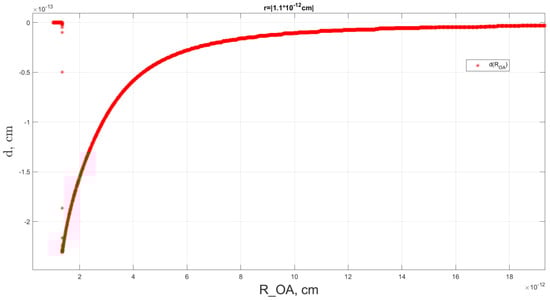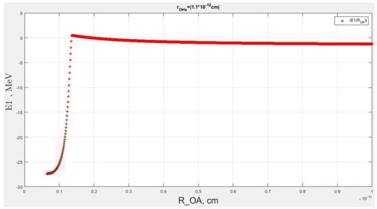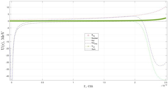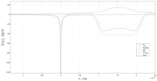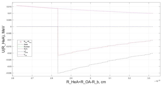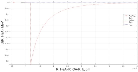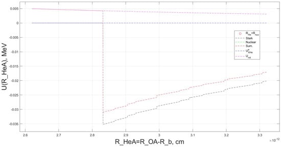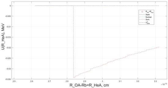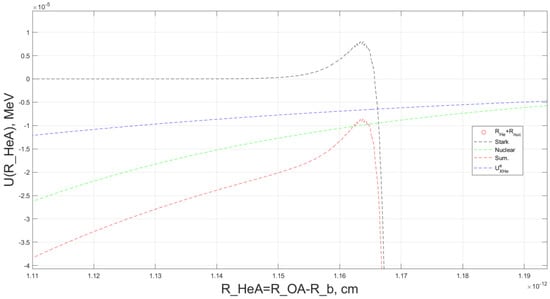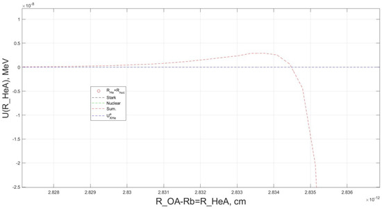 Since we are considering the three-body problem, we should take into account feedback between interacting particles, that is, the reverse impact of the results of interaction on its further course. Therefore, at the beginning, we consider the helium nucleus in the OHe– system and describe the forces acting on helium, that is, we restore the total potential for helium in the OHe– system and solve the Schrödinger equation for it in order to calculate the values of the dipole moment of the polarized dark atom for each fixed position of the sodium nucleus . Thus, the influence of the sodium nucleus on the polarization of the dark atom, characterized by the magnitude of the dipole moment, is taken into account. Therefore, we, among other things, took into account the centrifugal interaction potential between the helium nucleus and the sodium nucleus , which affects the shape of the total interaction potential of helium in the OHe– system, , and through the influence on influences the values of the dipole moment. This can be seen, for example, from Figure 26, which, when comparing with Figure 22, one can notice that the depth of the potential well in the Stark potential, which in Figure 22 practically coincides with the total effective potential of interaction between OHe and the sodium nucleus, increased in Figure 26 after adding to the Schrödinger equation. This means that the potential influenced the negative values of the dipole moment of the polarized dark atom. Also, the addition of to the total helium interaction potential affected the height of the dipole Coulomb barrier in the Stark potential, slightly reducing it, since increases the positive potential barrier in and reduces the probability of helium tunneling into the nucleus of the heavy element. Thus, the influence of the sodium nucleus on the polarization of OHe is first taken into account, after which the already polarized dark atom influences the sodium nucleus, interacting with it as a dipole. This interaction is characterized by the Stark potential. In addition, sodium interacts with the dark atom as a whole also through the centrifugal interaction potential , through the nuclear potential and , which practically do not appear on large-distance scales between interacting particles.