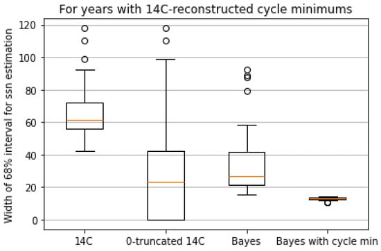 Information of cycle minimums does further reduce uncertainty of SSN estimated from 14C construction. Each boxplot is from 28 widths of the 68% intervals for the 28 years of plausible cycle minima found from the 14C reconstruction (listed in Table 1). For the boxplot above ‘14C’, the interval width for year j is ; for the boxplot above ‘0-truncated 14C’, the interval width for year j is , where is the 14C reconstruction and is the 1-sigma uncertainty. For both the boxplots above ‘Bayes’ and above ‘Bayes with cycle min’, each interval width is computed as the difference of the 84% quantile and the 16% quantile of the posterior distribution. For ‘Bayes with cycle min’, the prior distribution uses the telescopic observations of annual SSNs, only at years of cycle minima, between years 1818 and 2023. For ‘Bayes’, the prior distribution uses all the telescopic observations of annual SSNs, whether or not at cycle minima, between years 1818 and 2023.
