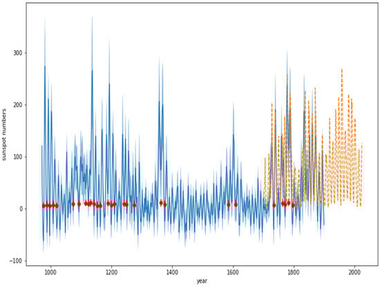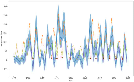 Side-to-side boxplots in Figure 2 confirm that the same phenomenon appears over all the cycle minimum years from the 14C reconstruction before 1818. In addition, the average widths for the 68% intervals are 66.8 for the 14C interval, 30.9 for the 0-truncated 14C interval, 36.5 for the Bayesian interval using telescopic SSN information from all years after 1818, and 12.9 for the Bayesian interval using telescopic SSN information after 1818 only at the cycle minima. Therefore, the cycle minimum information is very useful in reducing the uncertainty in 14C reconstruction of the SSN and reduces the average 68% interval width to less than a half. The usefulness of the cycle minimum information is related to the fact that the SSNs in the cycle minimum years are much smaller than the SSNs in other years, which influence the posterior distribution to focus on small and positive SSN values that allow much less uncertainty. In contrast, in the previous exercise, the SSNs in the years with NES records were not so much different from the SSNs in other years, as found in Usoskin et al. (2015) [6]. That is why the NES information was not so useful.