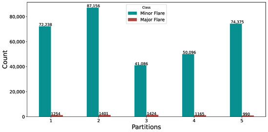 When the frequency of one class is significantly higher or lower than the others, the data are considered imbalanced [34]. The SWAN-SF dataset exhibits a high degree of imbalance, primarily due to the uneven frequency of flare classes. To address this and ensure balanced representation, the dataset is strategically divided into five partitions, each defined by specific time periods that contain a roughly equal number of significant flare events, such as M- and X-class flares. These partitions correspond to different phases of Solar Cycle 24, with the first partition covering the period from 1 May 2010 to 12 March 2012. The second extends from 2 March 2012 to 28 October 2013. The third spans from 17 October 2013 to 14 June 2014. The fourth is from 2 June 2014 to 18 March 2015, and the fifth and final partition ranges from 7 March 2015 to 16 August 2018. This structured partitioning aids in maintaining dataset balance, facilitating more effective training and testing of the prediction models. Figure 1 illustrates the distribution of flare classes across these partitions, highlighting the strategic data management employed.