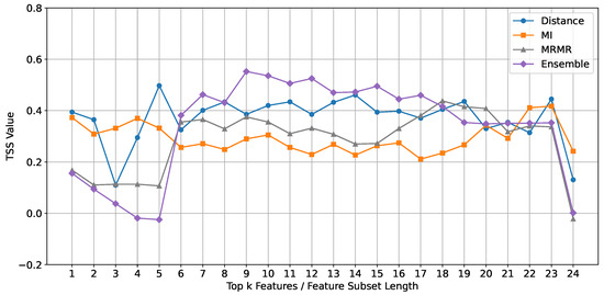 Random Forest Classifier: The performance of the Random Forest classifier, evaluated using the TSS metric, is depicted in Figure 6. The results indicate that the ensemble feature selection method consistently outperforms the individual methods (Mutual Information, mRMR, and Euclidean Distance) across different feature subset lengths.