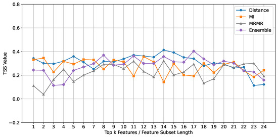 MINIROCKET Classifier: The performance of the MINIROCKET classifier, evaluated using the TSS metric, is depicted in Figure 7. Unlike the ROCKET and Random Forest classifiers, the ensemble feature selection method does not consistently outperform the individual methods (Mutual Information, mRMR, and Euclidean Distance) for MINIROCKET. Instead, the Euclidean Distance method shows better performance across feature subset lengths ranging from 10 to 15.