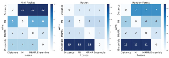 To provide a comprehensive comparison of the feature selection methods across different classifiers, a win–loss heat map was employed, as depicted in Figure 9. This heat map illustrates the number of times each feature selection method (Mutual Information, mRMR, Euclidean Distance, and Ensemble) outperformed the others across the three classifiers (MINIROCKET, ROCKET, and Random Forest). Each cell in the heat map represents the count of wins and losses for a specific feature selection method against another method for a given classifier, with darker shades indicating a higher count of wins.